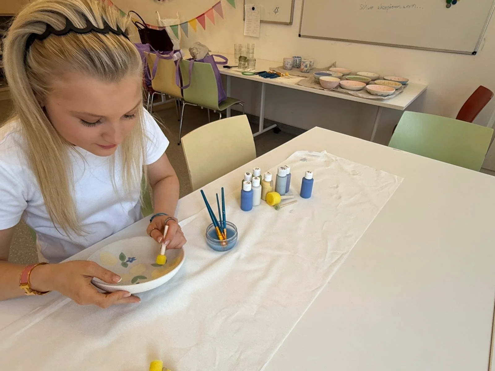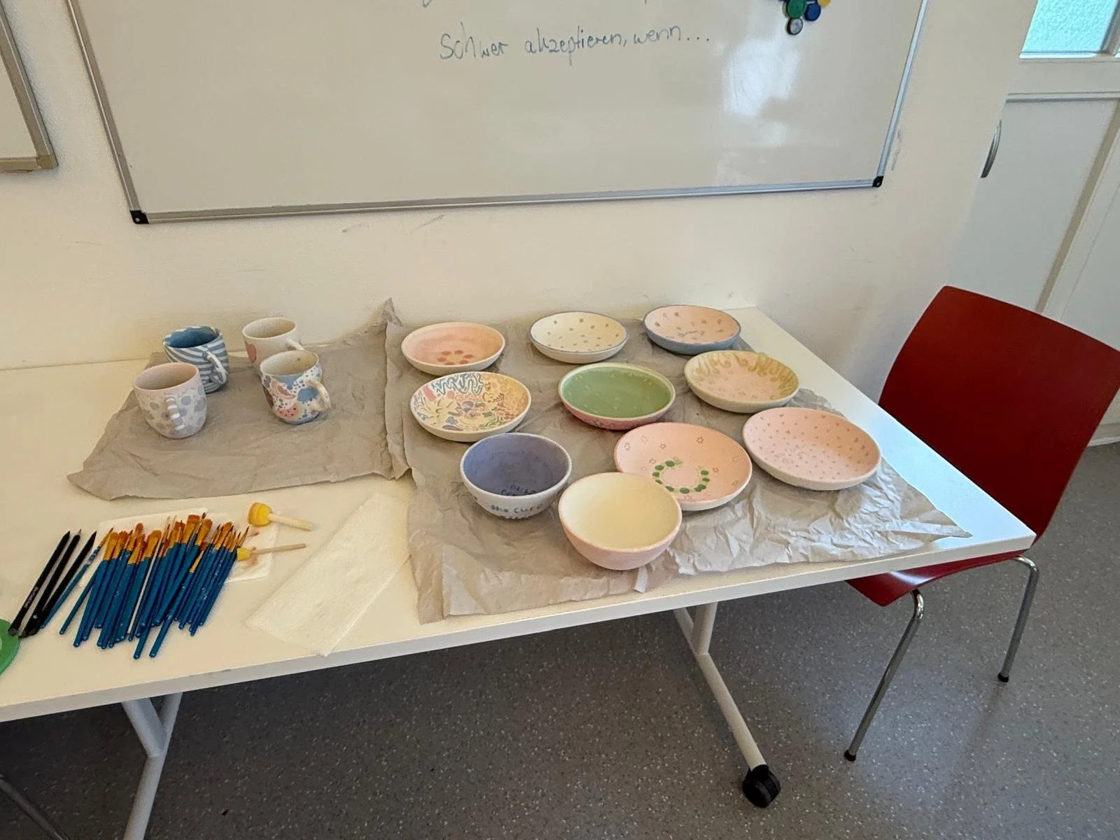 Mit großer Begeisterung und viel Fantasie wurden aus schlichten Tellern, Tassen, Bowls schöne kleine Kunstwerke - ganz nach persönlichen Geschmack. Sorgfältig und hochkonzentriert wurde hier gearbeitet - jeder Tupfer sitzt!
